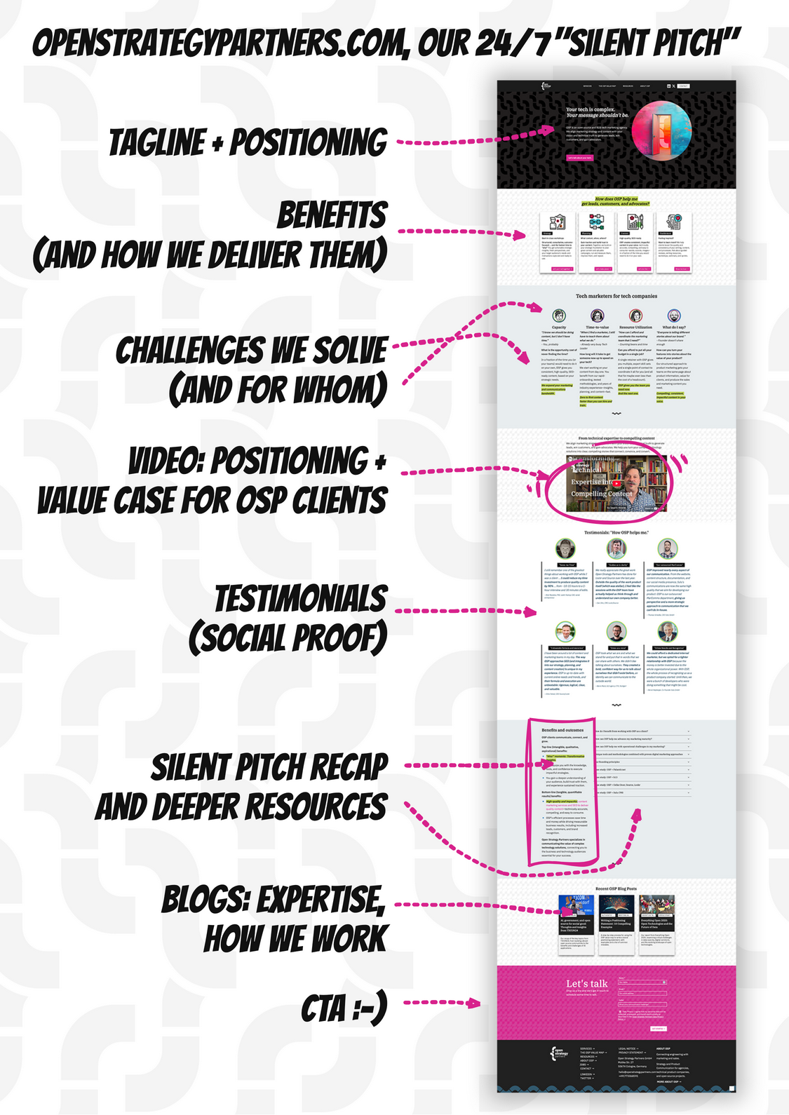 This idea came from a moment of internal clarity. My co-founder Tracy once said, "We’re not making any more pitch decks." At first, I was skeptical—how can you pitch without a deck? But she was right: our homepage already tells the story. It works 24/7, reflects our process, and links to deeper content. If we structure it like a pitch, anyone can use it to sell OSP anytime. And prospects who arrive there can move themselves further down the funnel before we even talk.