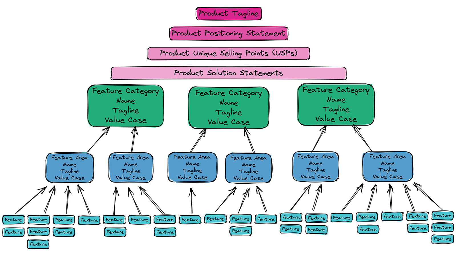 With the feature areas and categories in place, we engage with stakeholders to prioritize and agree on the top features, giving us insight into the product marketing stategy. Based on these rankings, we can determine the top features and craft an overarching product tagline, positioning statement, and other key solution statements.