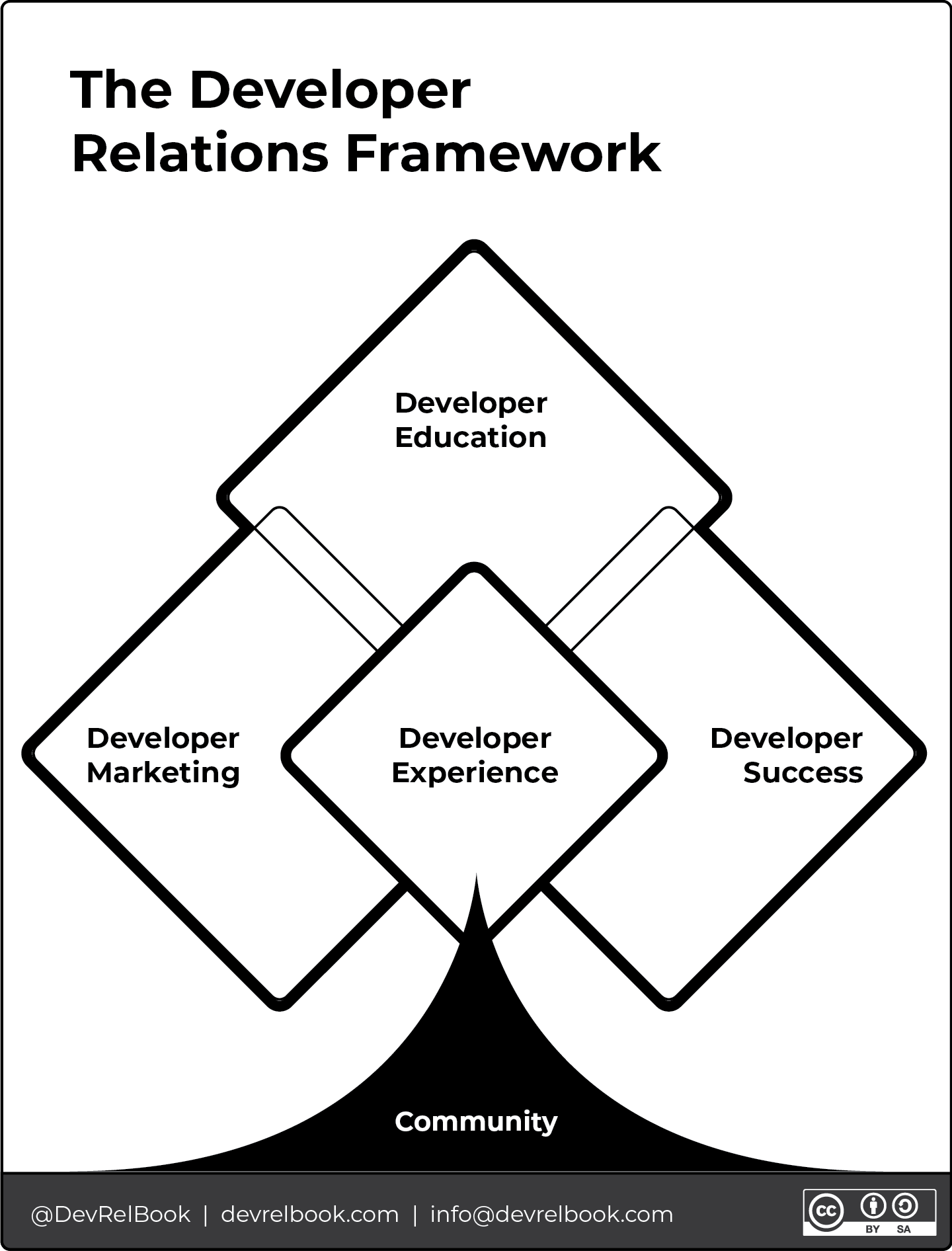 Caroline Lewko and James Parton give a fantastic overview and framework for understanding DevRel in their book, Developer Relations: How to Build and Grow a Successful Developer Program. They compellingly break down the essential elements of DevRel into five parts: Developer Experience, Marketing, Education, and Success, all built on the solid core of developer communities.
