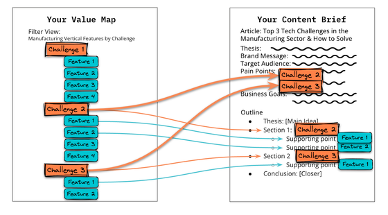 You then use the components of the Value Map when constructing all manner of company communications—a bit like using Lego bricks to build towers, tunnels, or mountains. This systematic approach allows us to create diverse content like sales materials, investor briefs, blog posts, and entire campaigns (and lots more) efficiently.