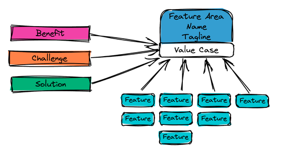 The Value Map is complex yet highly structured. It is a living repository of accurate, agreed-upon product features, the challenges they address, and the benefits they offer your audience. It takes shape through a rigorous process involving interviews with team members and stakeholders, and an exhaustive examination of your existing resources. We catalog all your features, grouping them into broader feature areas, which are then further organized into feature categories.
