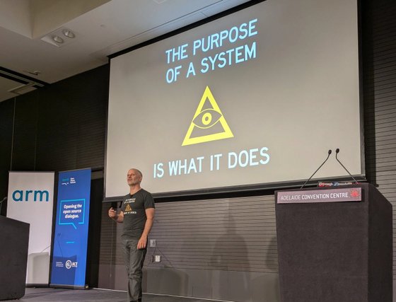 Justin Warren’s exploration of open source sustainability provided some hope to the growing challenges of maintaining collaborative technology ecosystems. He described how the traditional open-source model is under pressure, with multiple companies re-licensing projects and maintainer burnout becoming increasingly common. Channeling Stafford Beer’s iconic “The purpose of a system is what it does,” (complete with a matching t-shirt!) Justin argued that we often prioritize individual achievements over systemic health. Still, most of us share a fundamental aspiration: to share knowledge and data. Like Kathy, Justin referred to Elinor Ostrom’s work to highlight Ostrom’s 8 rules for managing the commons as the key to open source sustainability.