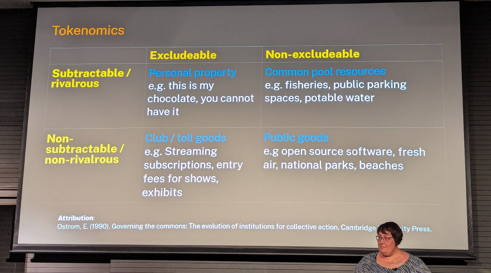 Citing Elinor Ostrom’s work on governing the commons, Kathy illustrated tokens as truly rivalrous resources: once used, they’re depleted, much like fish in an overfished lake. The critical question emerges: How do we prevent data overfishing while preserving it as a common pool resource?