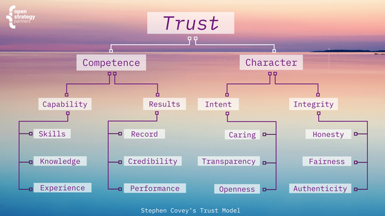 He breaks down the elements of trust into two main categories: Competence and Character. Both of these are relevant to people and organizations.