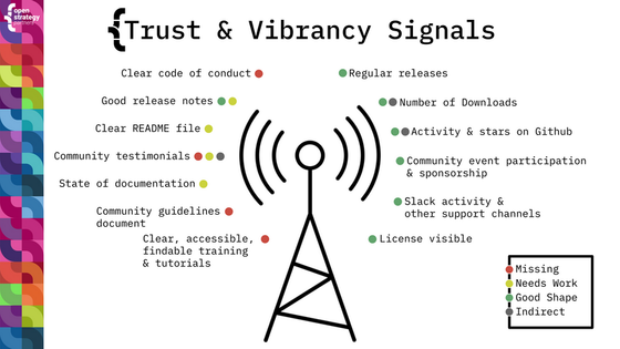 Open Strategy Partners conducts Trust & Vibrancy Signal audits, based on an outline of elements that signal trustworthiness in a project, product, company, or community. The signals are especially important in and around open source software, but most sales are based on trust, too.