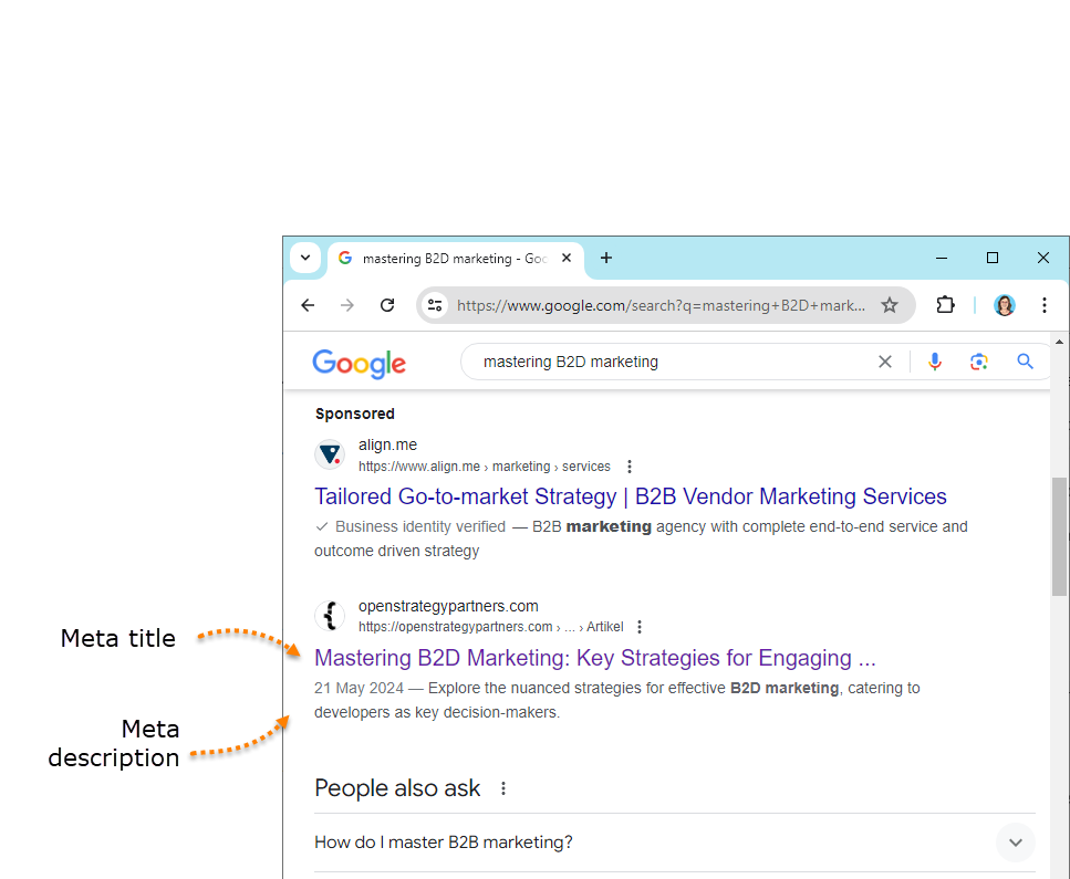 - Meta description: This text lives in the source code of the page and displays below the page title on search engine results pages.