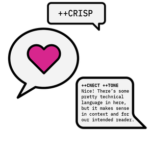 | Tone | CRIT | Avoid hidden or implied criticism. Don’t tell people they’re "doing it wrong". Externalise the problem away from the reader, for example, "a common mistake is." We can blame the software. We can suggest ways to do something better, make your day better, or improve efficiency. |