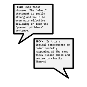 | Flow | FLOW | Organize the sections and paragraphs in a logical order and ensure they have an elegant flow and transition to them. |